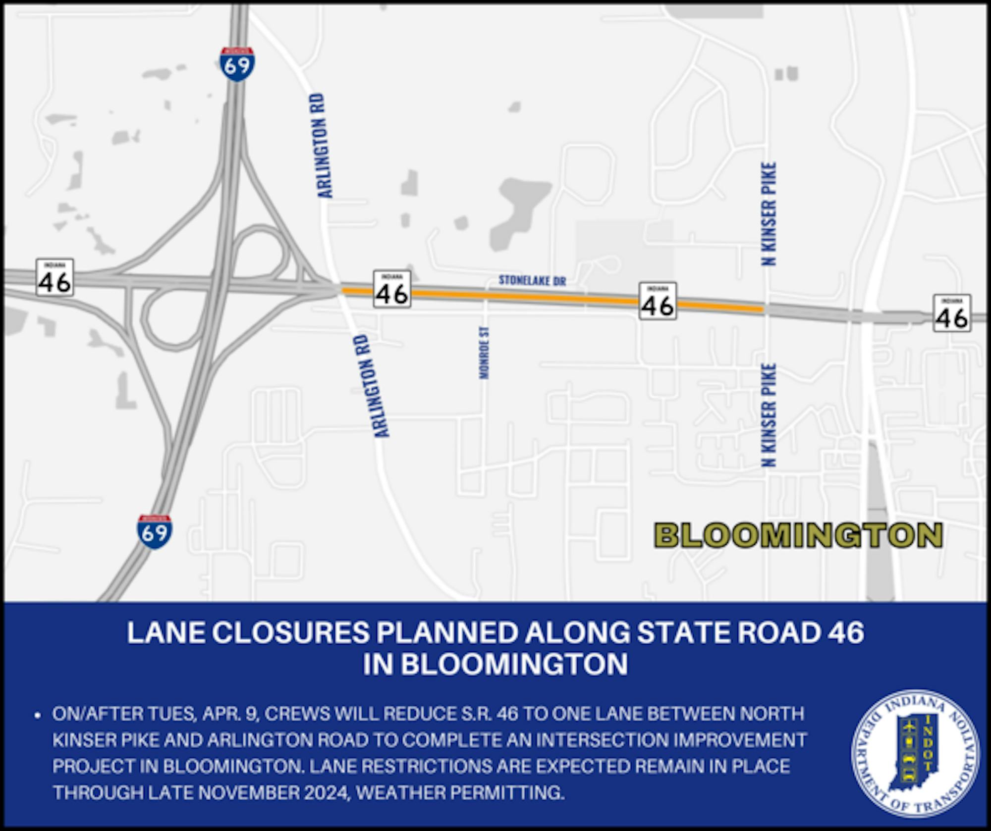 BLOOMINGTON, Ind. (IUSTV News) — Lane closures will begin this week along State Road 46 between Kinser Pike and Arlington Road, according to the Indiana Department of Transportation.