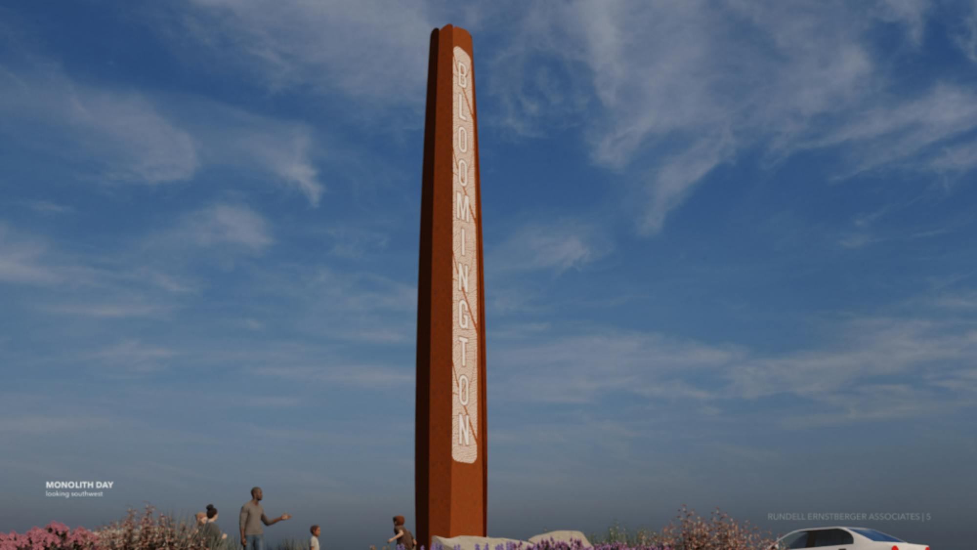 The original concept was a 40-foot monolith-style gateway with backlighted letters that spell out "Bloomington."