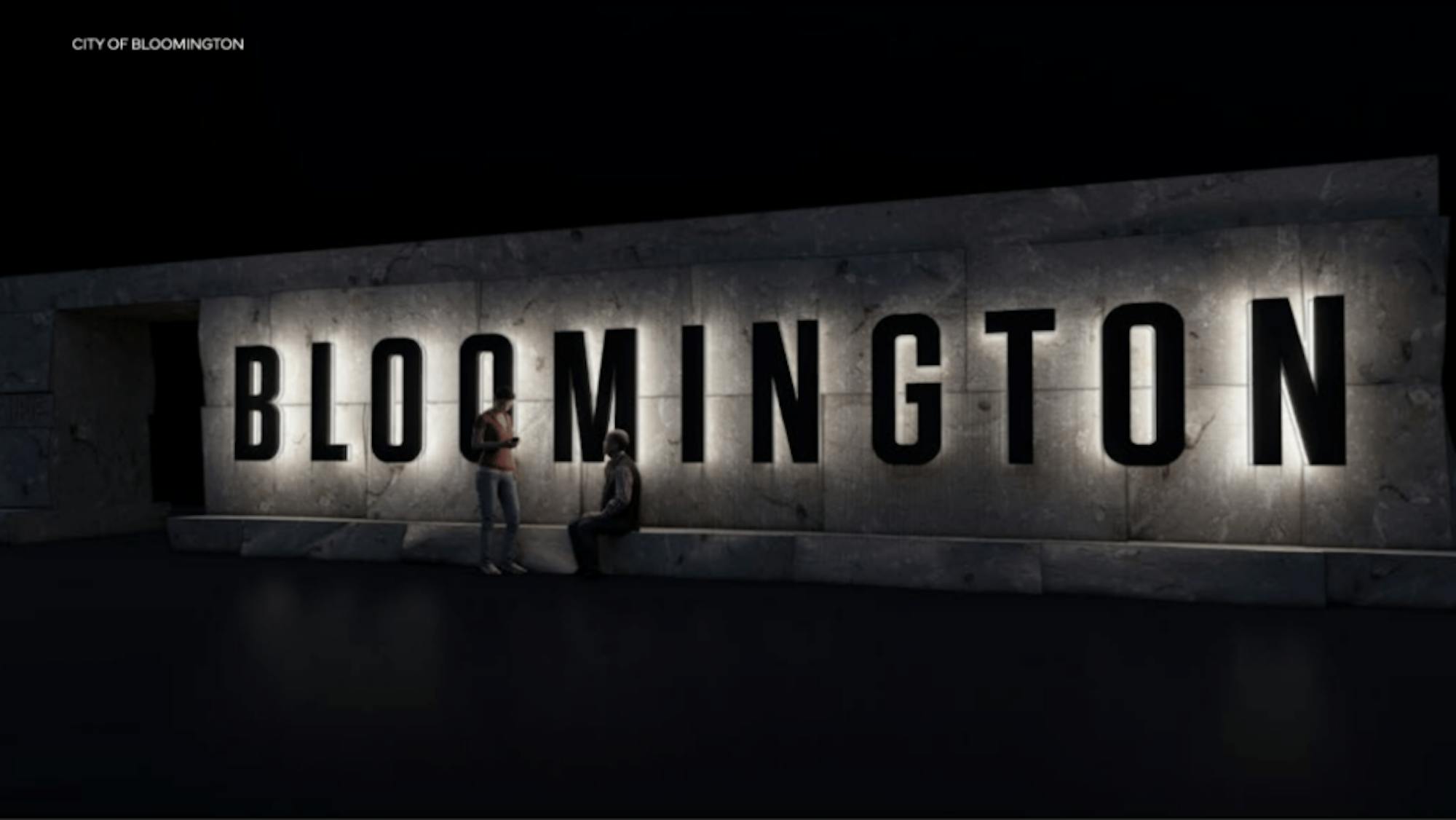 The new concept for the gateway, approved in January, features stacked limestone blocks that stand 10 feet high and feature backlighted letters that spell out "Bloomington."
